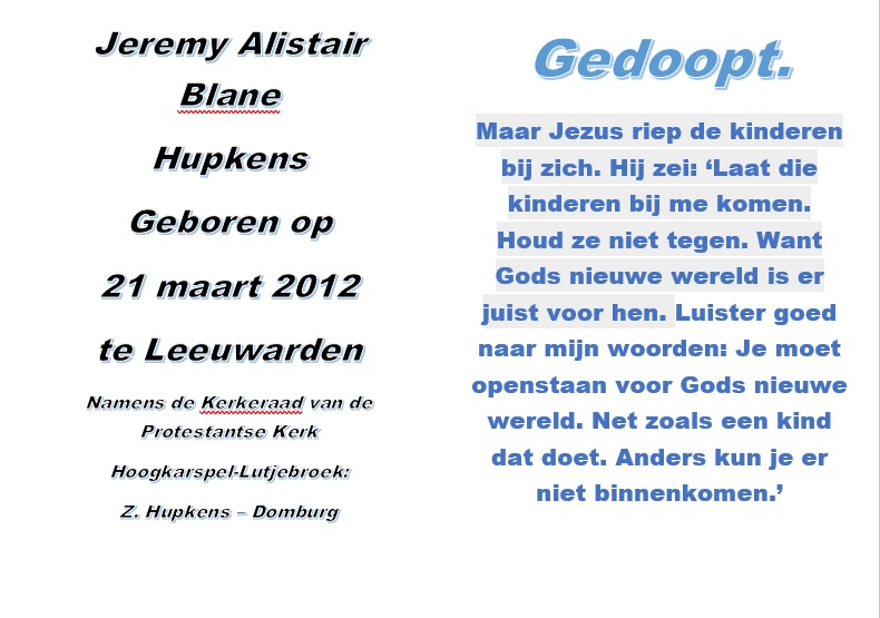 Doop Jeremy Hupkens 09-04-2023 door Henri Frölich | 11 april 2023 | Foto impressies | 0 Reacties Reactie verzenden Reactie annulerenJe e-mailadres wordt niet gepubliceerd. Vereiste velden zijn gemarkeerd met *Reactie * Naam * E-mail * Site Mijn naam, e-mail en site opslaan in deze browser voor de volgende keer wanneer ik een reactie plaats.
